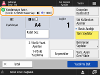 Üzerine yazdırılacak kağıt boyutu ve baskı sayısı gibi ayar durumunu gösterir. Doğru şekilde yazdırmak için ayarları doğruladığınızdan emin olun. Ayarları değiştirmek için, ekran bölümünün altındaki düğmeye basın. Baskı sayısını değiştirmek için sayı tuşlarını kullanarak sayıyı girin.