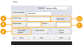 אם תנסה לשלוח לשרת קבצים/סביבה מתקדמת שבו האפשרות <אישור לפני שליחה> מוגדרת כ-<מופעל>, יופיע מסך המבקש ממך להזין שם משתמש וסיסמה. במקרה זה, הזן את הסיסמה שהוגדרה קודם לכן. אם ברצונך לרשום שרת קבצים/סביבה מתקדמת בכתובת קבוצה, הגדר את האפשרות <אישור לפני שליחה> כ-<כבוי>. לא ניתן לשלוח לכתובת קבוצה הכוללת שרת קבצים/סביבה מתקדמת שבו האפשרות <אישור לפני שליחה> מוגדרת כ-<מופעל>.