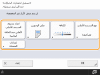 يمكن تغيير أزرار الإعداد المعروضة في شاشات الميزات الأساسية (للنسخ، والفاكس، والمسح الضوئي) بأزرار إعداد آخر في <خيارات>. بتحديد مكان أزرار الإعداد المستخدمة بشكل متكرر في شاشة الميزات الأساسية، يمكنك استخدام الوظائف بمزيد من الكفاءة. بالإضافة إلى ذلك، من خلال بتسجيل الدخول باستخدام إدارة المصادقة الشخصية، يمكنك عرض شاشة وظائف أساسية مختلفة مخصصة لكل مستخدم.