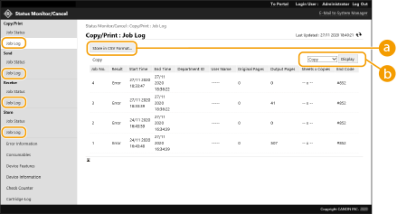 يمكنك استخدام Remote UI (واجهة المستخدم البعيدة) للتحقق من حالة المستندات التي تنتظر المعالجة، بالإضافة إلى سجلات المستندات التي تمت معالجتها. يمكنك أيضًا التحقق من حالة الجهاز، مثل معلومات الخطأ والكمية المتبقية من المواد المستهلكة.