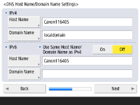 اگر تنظیمات IPv4 و IPv6 یکسان هستند، <On> را برای <Use Same Host Name/Domain Name as IPv4> فشار دهید.
