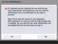 برای افزایش امنیت دستگاه از طریق غیرفعال کردن کاربر "سرپرست" و ثبت یک سرپرست جدید، <Yes> را فشار دهید. در Register Administrator، <User Name> و <Password> را وارد کنید و <OK> را فشار دهید. در صورت لزوم، <E-Mail Address>، <Department ID>، و <Display Name> را مشخص کنید. برای کسب اطلاعات بیشتر، به ثبت اطلاعات کاربر در دستگاه محلی مراجعه کنید. دفعه بعد که وارد سیستم شوید، کاربر "سرپرست" غیرفعال خواهد شد.