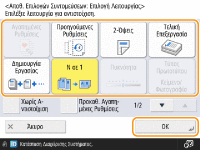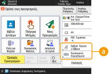 Καταχώριση στις ρυθμίσεις <Αγαπημένες Ρυθμίσεις>Στις ρυθμίσεις <Αγαπημένες Ρυθμίσεις>, μπορείτε να καταχωρίσετε τις συχνά χρησιμοποιούμενες διαδικασίες για τη λειτουργία αντιγραφής, καθώς και τους συχνά καθοριζόμενους προορισμούς και τις ρυθμίσεις για τη λειτουργία σάρωσης. Για περισσότερες πληροφορίες, ανατρέξτε στην ενότητα Αποθήκευση συνδυασμού των συχνά χρησιμοποιούμενων λειτουργιών.