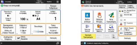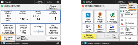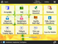 Μπορείτε να αλλάξετε τα πλήκτρα ρυθμίσεων που εμφανίζονται στις οθόνες βασικών λειτουργιών (για αντιγραφή, φαξ και σάρωση). Μπορείτε επίσης να εμφανίσετε μια διαφορετική οθόνη βασικών λειτουργιών, προσαρμοσμένη για κάθε συνδεδεμένο χρήστη.