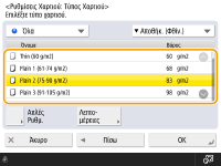 Εάν δεν εμφανίζεται ο τύπος χαρτιού, πατήστε <Λεπτομ. Ρυθμ.> για να επιλέξετε από τη λίστα.