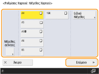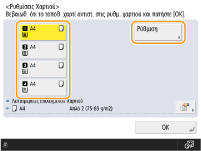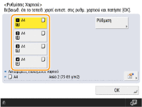 Εάν το μέγεθος/ο τύπος χαρτιού που εμφανίζεται είναι διαφορετικό από το μέγεθος/τύπο χαρτιού που έχει φορτωθεί, επιλέξτε την πηγή χαρτιού στην οποία έχει τοποθετηθεί το χαρτί και πατήστε <Ρύθμιση>.
