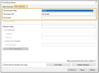 Κάντε κλικ στην καρτέλα [Enter Destination] και καθορίστε τη λειτουργία επικοινωνίας και τον αριθμό φαξ που χρησιμοποιείτε.