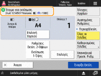 Εμφανίζει την κατάσταση ρυθμίσεων, όπως μέγεθος χαρτιού για την εκτύπωση και πλήθος εκτυπώσεων. Βεβαιωθείτε ότι έχετε επιβεβαιώσει τις ρυθμίσεις για να εκτελεστεί σωστά η εκτύπωση. Για να αλλάξετε τις ρυθμίσεις, πατήστε το κουμπί κάτω από το τμήμα της οθόνης. Για να αλλάξετε το πλήθος των εκτυπώσεων, πληκτρολογήστε τον αριθμό χρησιμοποιώντας τα αριθμητικά πλήκτρα.