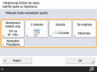 Gumbe za nastavitve, ki so prikazani na zaslonih z osnovnimi funkcijami (za kopiranje, pošiljanje faksov in optično branje), je mogoče spremeniti z drugimi gumbi za nastavitve v <Opcije>. S pogosto uporabljenimi gumbi za nastavitve na zaslonu z osnovnimi funkcijami lahko učinkoviteje uporabljate funkcije. Poleg tega lahko prikažete različen zaslon z osnovnimi funkcijami, prilagojen za posameznega uporabnika.