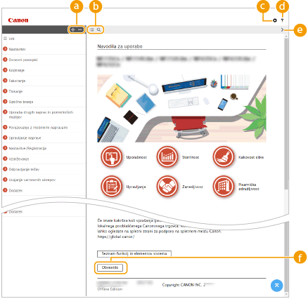 Kliknite, da preklopite med kazalom vsebine in zaslonom za iskanje. Ko je prikazano kazalo, z vsakim klikom možnosti  preklopite med možnostjo skrivanja in prikaza zaslona. Ko je prikazan zaslon za iskanje, z vsakim klikom možnosti  preklopite med možnostjo skrivanja in prikaza zaslona.