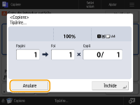 (Stop) de pe panoul de control când lucrările de imprimare sunt în așteptare, toate lucrările de copiere sunt întrerupte și se afișează mesajul <StopSelectaţi lucrarea de copiere de anulat.> și lista lucrărilor de copiere. Puteți să selectați din listă o lucrare de copiere și să o anulați apăsând <Anulare>. Dacă doriți să reluați copierea, apăsați <Reluare copiere>. |