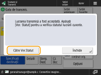 Când opţiunea <Afişare Notificare când lucrarea este acceptată> este setată la <Pornit>, ecranul <Monitor Statut> poate fi afişat din ecranul următor care se afişează după ce este primită o lucrare trimisă. <Afişare Notificare când lucrarea este acceptată>