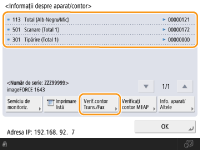 Puteți verifica, de asemenea, informațiile de contorizare pentru fiecare MEAP. Apăsați <Verificaţi contor MEAP> pe ecranul din etapa 2. Dacă apăsați <Info. aparat/Altele>