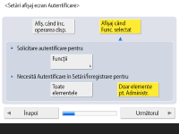 ![]() Acest aparat este setat să utilizeze autentificarea utilizatorilor ca serviciu de conectare. Pentru mai multe informații, consultați Configurarea setărilor de gestionare a autentificării personale.