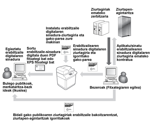 Erabiltzaile-sinadura ezartzean eskatzen diren gakoa eta ziurtagiria (erabiltzaile-ziurtagiria) Urruneko EIaren bitartez gorde daitezke. Ezarri administratzaile bat elementu horiek gordetzeko. Gorde ondoren, autentifikazio pertsonalarekin saioa hasten duten erabiltzaileek sinadura digitala ezar dezakete fitxategi-formatu zehatz batean bidaltzen diren dokumentu eskaneatuetan. Sinadura digitala gehitzea