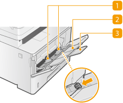 Adjust the paper guides to exactly the width of the loaded paper to ensure that paper is fed straight into the machine. Press the lock release lever that is marked with arrow in the illustration to release the lock and slide the paper guides.