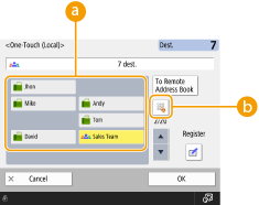 For the administratorThe Address Book and one-touch buttons can be exported/imported. This can be used for backup data if a failure occurs or to simplify the procedure for registering destinations between supported machines. For more information, see Importing/Exporting the Settings Individually. The Address Book can be personalized for each logged-in user (List of Items That Can Be Personalized). Furthermore, the Synchronize Custom Settings facility can be used to enable the Address Book to be shared by a number of Canon multifunction printers (Synchronizing Settings for Multiple Canon Multifunction Printers). You can set a password to avoid unauthorized editing or deletion in the Address Book. Setting a PIN for Address Book If there are destinations that you do not want to display in the Address Book or if you want to limit user access to destinations, enter an access number when registering a destination. To use the access number, it is necessary to activate the setting in advance in Restricting Access to Destinations Registered in the Address Book. Configure User Group Address Lists from the Remote UI. (Registering Destinations via the Remote UI) |