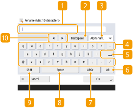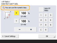 When displaying the numeric keys iconWhen < You can use numeric keys.> is displayed, you can enter numerical values using the numeric keys on the right of the touch panel display.Example: <XY Ratio> setting screen ![]() When < Enter using the numeric keys.> is displayed, only the numeric keys on the right of the touch panel display can be used for entering numbers.Enter characters from the USB keyboardTo enter characters, you can also use a USB keyboard by connecting it to the USB port (Front Side). Note the following points when entering from a USB keyboard. Set <Use MEAP Driver for USB Input Device> in <USB Settings> to <Off>. <Use MEAP Driver for USB Input Device> You can only enter ASCII characters from a USB keyboard. Keys that are not displayed on the keyboard screen of the touch panel display, such as Delete, End, Tab, Esc, and function keys, cannot be used on a USB keyboard. The entering sound of a USB keyboard is produced based on the <Entry Tone> and <Invalid Entry Tone> settings on the sound setting screen. Setting Sounds |