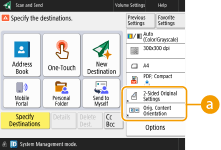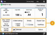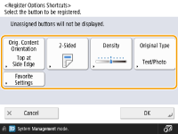 The number of setting items located on the Basic Features screen and the location to be displayed differ depending on functions. A shortcut button is not displayed if <Unassigned> is set as a shortcut. The limit to the number of shortcuts for <Options> you can register is as follows. Copy: 5 Fax: 4 Scan and Send: 2 |