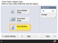 1 | Press <Erase Book Frame> and confirm <Original Size>. ![]() If the size displayed in <Original Size> is different from the size of the book you set, press <Change> to select the size. |