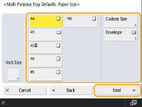2 | Select the type of envelopes. ![]() To register a custom size envelope, press <Custom> <Next> and press <X> or <Y> to specify the side, then use the numeric keys to enter the length of the specified side. |