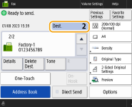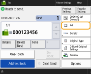 To check the total number of specified destinationsThe total number of specified destinations is displayed on the top right of the screen. This enables you to confirm that the number of destinations is correct before sending. ![]() To send with the sender informationYou can send with the sender's name and fax number. <TX Terminal ID> To check the statuses for sent documentsOn the <Status Monitor> screen, you can check the statuses for sent documents. This screen enables you to send faxes again or cancel sending after checking the statuses. Checking Status and Log for Sent and Received Documents When <Display Notification When Job Is Accepted> is set to <On>, the <Status Monitor> screen can be displayed from the following screen that is shown after a send job is received. <Display Notification When Job Is Accepted> ![]() When a transmission error occurs because the recipient's line is busyThe machine automatically redials after a certain period of time. You can change the settings such as how many times the machine redials and the interval between redials. <Auto Redial> To print the report for the results of sendingOn the Fax Basic Features screen, pressing <Options> <TX Result Report> enables you to set to automatically print the report listing the results of sending.To set this for each job from <Options>, it is necessary to select <For Error Only> or <Off> in <TX Result Report>, and then set <Allow Printing from Options> to <On>. When photos in the sent image are too dark or light colors in the background of color originals cannot be removedThe quality of the sent image may be able to be improved if the following conditions/settings are met. Job type: Fax (Memory Sending) or Scan and Send (Fax/I-fax) <Select Color>: <Black & White> (Scan and Send) <Original Type>: <Text> <Density> <Background Density>: <Auto><Resolution>: 200 dpi x 400 dpi, 300 dpi x 300 dpi*, 400 dpi x 400 dpi, or 600 dpi x 600 dpi* *Can be set for Scan and Send <Speed/Image Quality Priority for Black & White Scan> Fax/I-Fax Send Jobs: <Quality Priority> (<Speed/Image Quality Priority for Black & White Scan>) |