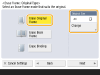 <Erase Frame>.1 | Press <Erase Original Frame> and check <Original Size>. ![]() If the size displayed in <Original Size> is different from the size of the original, press <Change> to select the size. You can only set the Erase Original Frame mode for the original sizes shown on the touch panel display. |