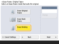 1 | Press <Erase Book Frame> and check <Original Size>. ![]() If the size displayed in <Original Size> is different from the size of the book, press <Change> to select the size. You can only set the Erase Book Frame mode for the original sizes shown on the touch panel display. |