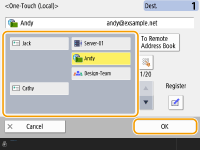 You can press <Register to Address Book> to register the entered destination. Set the required conditions, and specify <Name> and the address list from the address list drop-down list. For information on the settings, see