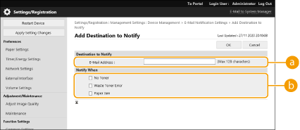 The result of sending the e-mail can be checked in [Status Monitor/Cancel] in [Job Log]. This setting can only be specified by a user with Administrator privileges. This setting can only be imported from/exported to the same series machines. Importing/Exporting the Setting Data This setting is included in [Settings/Registration Basic Information] when batch exporting. Importing/Exporting All Settings |