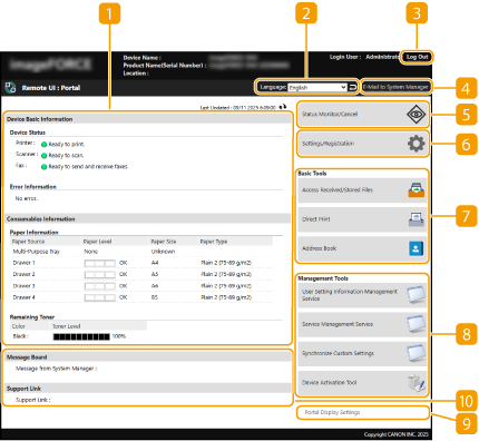 Some display items and functions are only available if you log in with Administrator privileges. If multiple users are operating the Remote UI at the same time or the control panel of the machine is being operated at the same time as the Remote UI, the last operation that is performed is effective. |