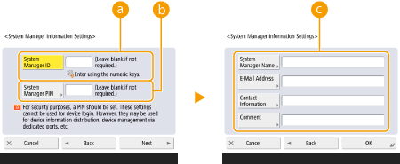 <System Manager Name> / <E-Mail Address> / <Contact Information> / <Comment>Enter information about the administrator as necessary.