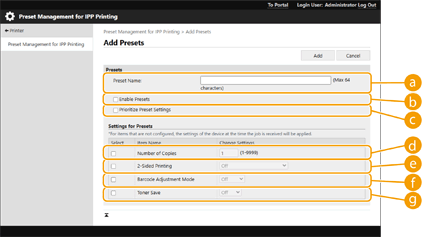 Select this check box to register the toner save setting in the preset. You can select [Off] or [On].