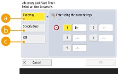 4 | Press <Memory Lock Start Time>, and specify the required settings. ![]() <Everyday>Set the time that memory reception starts. <Specify Days>Set the day of the week and time that memory reception starts. <Off>Select this when you do not want to set a memory reception start time.