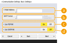 <Communication Settings>.1 | Specify the basic settings. ![]() <E-Mail Address>Enter the machine's e-mail address. You can specify any name as the user name (part at the left of @ mark). Enter the registered host name at the right of the @ mark. <SMTP Server>Enter an SMTP server name (or an IP address). After specifying the settings, check the connection for <SMTP>. ![]() When [Password] is specified in [Use SMTP Authentication (SMTP AUTH)] on the Remote UI, if you want to change and register the server address in [SMTP Server], entering the password in [Password] in [Use SMTP Authentication (SMTP AUTH)] is required. <Use POP RX>Press <On> when you want to receive e-mails and I-faxes using a POP3 server. <Use SMTP RX>Press <On> when you want to make the machine an SMTP server to receive e-mails and I-faxes. Be aware that you cannot receive via SMTP if you don't register the host name of the machine on the DNS server. |