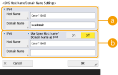2 | Carry out the necessary settings. ![]() <IPv4>Press <Host Name>, and enter the host name of the machine to register on the DNS server using alphanumeric characters. Press <Domain Name>, and enter the domain name which the machine belongs to using alphanumeric characters (Example: "example.com"). <IPv6>To set the host name and domain name to be the same as IPv4, press <On> in <Use Same Host Name/Domain Name as IPv4>. To set to be different from those of IPv4, press <Off>. To set the host name to be different from IPv4, press <Host Name> and enter the host name of the machine to register on the DNS server using alphanumeric characters. To set the domain name to be different from IPv4, press <Domain Name> and enter the domain name that the machine belongs to using alphanumeric characters. (Example: "example.com"). ![]() If you set <Use DHCPv6> to <On> for the stateful address settings (Setting an IPv6 Address), the manually configured domain name is overwritten. If you set <Use Same Host Name/Domain Name as IPv4> to <On>, the domain name that is retrieved from DHCPv6 server is used. |