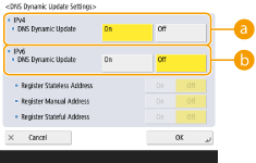 2 | Carry out the necessary settings. ![]() <IPv4>To automatically update the information when correspondence between the host name and the IP address is changed in an environment such as DHCP, press <On> in <DNS Dynamic Update>. <IPv6>To automatically update the information when correspondence between the host name and the IP address is changed in an environment such as DHCP, press <On> in <DNS Dynamic Update>. Turn <On> the address you want to register as a DNS server in <Register Stateless Address>/<Register Manual Address>/<Register Stateful Address>. Please note that automatic update cannot be carried out if all are set to <Off>. |