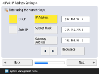 Specify the settings for network connection. ![]() ![]() Press <On> for <Use IPv4> or <Use IPv6>, and press <Next>. You can also use both IPv4 and IPv6. If you press <Off> for <Use IPv4> and <Use IPv6>, and press <OK>, skip the network settings and proceed to Step 9. ![]() If you press <On> for <Use IPv4>, specify the following settings. ![]() To obtain the IP address automatically, press <DHCP> or <Auto IP>, and press <Next> or <OK>. To set the IP address manually, clear the selection for <DHCP> or <Auto IP>, press <IP Address>, <Subnet Mask>, and <Gateway Address> to enter each value, and press <Next> or <OK>. For information on the IPV4 address settings, see Setting an IPv4 Address. ![]() If you press <On> for <Use IPv6>, specify the following settings. ![]() Press <On> to use the stateless address or <Off> to not use the stateless address, and press <Next>. For information on the IPv6 address, see Setting an IPv6 Address. ![]() After specifying the stateless address, specify the following settings. ![]() Press <On> to use the manual address or <Off> no not use the manual address, and press <Next>. To use the manual address, press <Manual Address>, <Prefix Length>, and <Default Router Address> to enter each value. ![]() After specifying the manual address, specify the following settings. ![]() Press <On> to use DHCPv6 or <Off> to not use DHCPv6, and press <OK>. | |