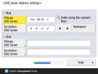 Specify the DNS server address, DNS host name, and DNS domain name. ![]() ![]() Press <Primary DNS Server> and <Secondary DNS Server>, enter IPV4/IPv6 address for the DNS server, and press <Next>. For information on the settings of the DNS server address, see Making DNS Settings. ![]() ![]() Press <Host Name> to enter the name of the machine (host name). Press <Domain Name> to enter the domain name that the machine belongs to, and press <Next>. If the settings of IPv4 and IPv6 are the same, press <On> for <Use Same Host Name/Domain Name as IPv4>. ![]() ![]() To update automatically using the DNS Dynamic Update Settings, press <On> for <DNS Dynamic Update>, and press <OK>. If you set <DNS Dynamic Update> for <IPv6> to <On>, select <On> for the items to register automatically. | |