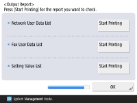 You can print the network user list, fax user data list, and adjusted value list. ![]() ![]() Press <Start Printing> for the report you want to print. When printing is complete, or if you do not print a list, press <OK>. | |