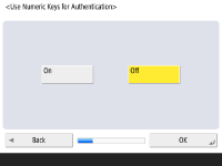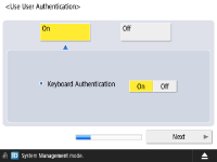 To enhance the security of the machine, use the machine under a system that uses user authentication. ![]() This machine is set to use the user authentication as the login service. For more information, see Configuring the Personal Authentication Management Settings. ![]() Press <On> for <Use User Authentication>, press <On> for the login method to use, and press <Next>. If you do not use user authentication, press <Off> for <Use User Authentication>, press <OK>, and proceed to Step 5. ![]() Specify the following settings if there are no administrators besides the "Administrator" user registered in the machine. ![]() To enhance the security of the machine by disabling the "Administrator" user and registering a new administrator, press <Yes>. In Register Administrator, enter <User Name> and <Password>, and press <OK>. Specify <E-Mail Address>, <Department ID>, and <Display Name> as necessary. For more information, see Registering User Information in the Local Device. The "Administrator" user will be disabled the next time you log in. To operate as "Administrator," press <No>. ![]() ![]() Select the timing for displaying the login screen. If you select <Display When Func. Selected>, press <Functions>, select the function to display the login screen for, and press <OK>. Also, select the setting items on the <Settings/Registration> screen to display the login screen for. If you select <Off> for <Keyboard Authentication>, press <OK>. Proceed to step 5. If you select <On> for <Keyboard Authentication>, press <Next>. ![]() ![]() To use authentication via numeric key entry only on the login screen, press <On>, and press <OK>. | |