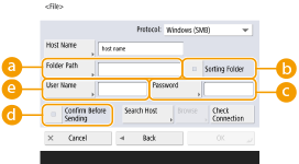 1 | Enter the host name of the file server/Advanced Box which transmits data. ![]() Ask your Network administrator about the information on the file server/Advanced Box. <Protocol>Select a protocol for the file server from <Windows (SMB)>, <FTP> and <WebDAV>. When sending a document to the Advanced Box, select <Windows (SMB)> or <WebDAV>. ![]() If you select <Windows (SMB)>, the <Search Host> and <Browse> buttons are displayed. You can easily specify a file server/Advanced Box by searching or viewing the network. By default, you cannot use <Browse>. You can use it only if SMB v1.0 is enabled in the SMB version setting. <Specify SMB Client Version> You can register up to five Directory servers used in <Browse>. <Host Name>Enter the host name of the file server/Advanced Box. If you select <FTP> for protocol, enter <Host Name> as follows. When TLS is disabled Example: To save to the Shared Space: ftp://<host name>/share To save to the Personal Space: ftp://<host name>/users When TLS is enabled Example: To save to the Shared Space: ftps://<host name>/share To save to the Personal Space: ftps://<host name>/users When sending a document to the Advanced Box, enter <Host Name> as follows. If you select <Windows (SMB)> for the protocol Example: To save to the Shared Space: \\192.168.100.50\share To save to the Personal Space: \\192.168.100.50\users If you select <WebDAV> for protocol, enter <Host Name> as follows and press <Next>. When TLS is disabled Example: To save to the Shared Space: http://<IP address or host name>/ To save to the Personal Space: http://<IP address or host name>/ When TLS is enabled Example: To save to the Shared Space: https://<IP address or host name>/ To save to the Personal Space: https://<IP address or host name>/ <Check Connection>Press this button after entering the host name to confirm the connection with the file server/Advanced Box. ![]() If you are using a login service such as personal authentication management, it is necessary to enter <User Name> and <Password>. |