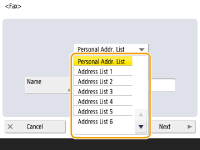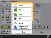![]() | You can register a recipient's fax number or an e-mail address that can be used when sending scanned documents in the Address Book. You can also register an I-fax destination, a file server folder location (IP address and path), and the storage (Advanced Box) of a Canon multifunction printer in the Address Book as a destination. |