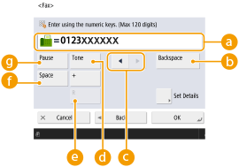 1 | Enter the fax number. ![]() Fax number fieldEnter the fax number using the numeric keys. Enter to as necessary. <Backspace> Delete numbers to the left of the cursor in the fax number field ( ) one by one.![]() /![]() Press when moving the fax number field cursor ( ) to the left or right. <Tone>If you press this button, the character "T" (tone) is inserted. Even if you are using pulse dial, numbers following "T" will be sent using tone dial. <R> keyIf the machine is connected to a PBX (Private Branch Exchange), press this button before entering the destination. If this button is not available, you need to register the R-key settings. <R-Key Setting> <Space>Enter a blank space between numbers to make them easier to read. <Pause>If you press this button, the character "P" (pause) is inserted. When sending a fax overseas, insert pauses after the international access code or fax number. This helps to improve the connection. ![]() You cannot insert a pause at the beginning of a number. |