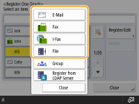 Select <Fax>, <E-Mail>, <I-Fax>, or <File> as the type of destination to register. Registering Destinations in the Address Book