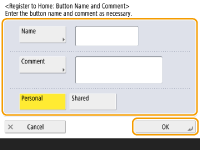 To register a Personal button, you need to log in with personal authentication management. Configuring the Personal Authentication Management Settings If you select <Device Login Authentication Information> for <Information Used for File TX/Browsing Authentication>, a password for a file destination is not stored in a Personal button. <Information Used for File TX/Browsing Authentication> For information on the maximum number of Personal buttons and Shared buttons that can be registered, see Management Functions. Personal buttons cannot be changed to Shared buttons, and vice-versa. To do so, recall the settings and register another button from .Press and hold a button to change its name/comment or move/delete it. The same operations (changing the name/comment of a button or moving/deleting a button) can be performed from on the <Home> screen. Customizing the <Home> ScreenPersonal buttons can be shared between multiple devices by synchronizing personalized data. List of Items That Can Be Personalized Settings that can be registered in Personal buttons/Shared buttonsFunctions and settings that can be registered in Personal buttons/Shared buttons are indicated below. Settings that can be registered in <Favorite Settings> for the <Copy> function Reducing Copying Operations <Fax> function settings of the machine Basic Operations for Sending Faxes Settings that can be registered in <Favorite Settings> for the <Scan and Send> function Useful Scanning Functions Settings that can be registered in <Favorite Settings> for the <Scan and Store> function Setting Screen and Operations for Scanning to Save Save locations for the <Scan and Store> and <Access Stored Files> functions Using Storage Space Shortcuts to the Basic Features screen for the <Fax/I-Fax Inbox> function Access to a server and the login password can be registered to Personal buttons/Shared buttons. This is convenient for skipping password entry when recalling the registered button. If you want to set password in the settings stored in the registered button, as you often import settings in a Personal button or Shared button to another machine and you want to prevent users from pretending to be other users, exclude a password when registering. Importing/exporting the registered buttonsYou can import and export the registered Personal/Shared buttons from the Remote UI. Importing/Exporting All Settings Batch import of Personal buttons/Shared buttons may not be available, depending on the model of the machine to import from. For more information, contact your dealer or service representative. |
