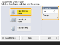 1 | Press <Erase Original Frame> and set <Original Size>. ![]() If the size displayed in <Original Size> is different from the size of the original you set, press <Change> to select the size. |