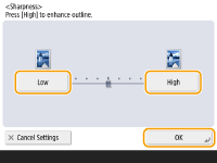 Set the sharpness to <High> when you want to copy originals containing text or fine lines. Set the sharpness to <Low> when you want to copy originals containing printed photographs or other halftones.