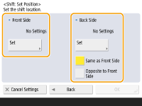 If you want to move the image on the back side when copying both sides, the <Back Side> setting is needed. To move to the same position as the front side, press <Same as Front Side>. To move symmetrically, press <Opposite to Front Side>. To move to a position different from the front side, press <Set> and enter the moving distance.