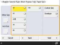 Press <Preferences>  <Paper Settings>  <Register Favorite Paper (Multi-Purpose Tray)>.